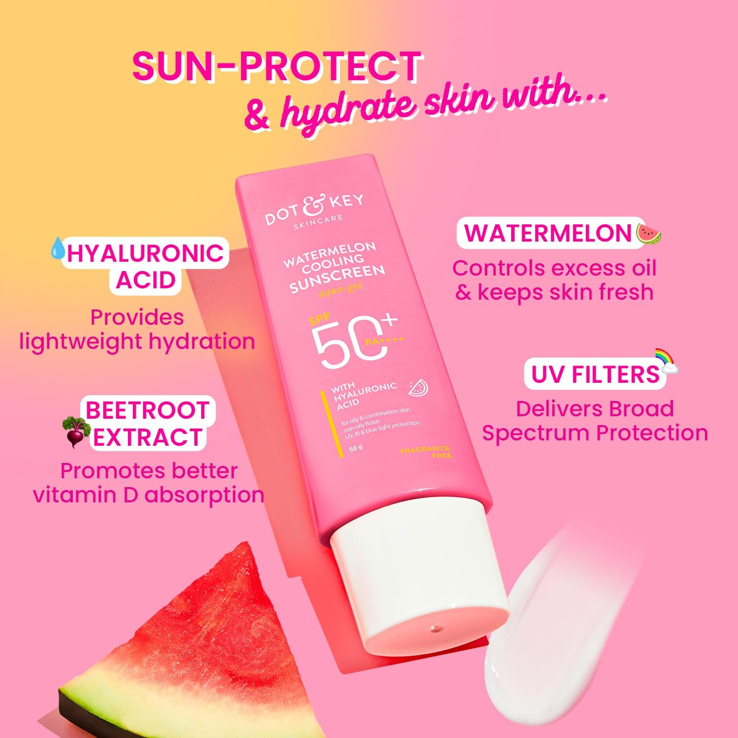 - LIGHTWEIGHT, NON-STICKY, ZERO WHITE CAST FOR ALL SKIN TYPES: Watermelon Hyaluronic Cooling Sunscreen SPF 50 PA+++ is Lightweight, fragrance-free, and colour-free sunscreen with gel cream texture that provides full absorbency with zero white cast and does not clog the pores, suitable for all skin types. Whether you’ve normal skin, dry skin, oily skin, combination skin, or even sensitive skin were safe for you; Paraben-free, Cruelty-free.